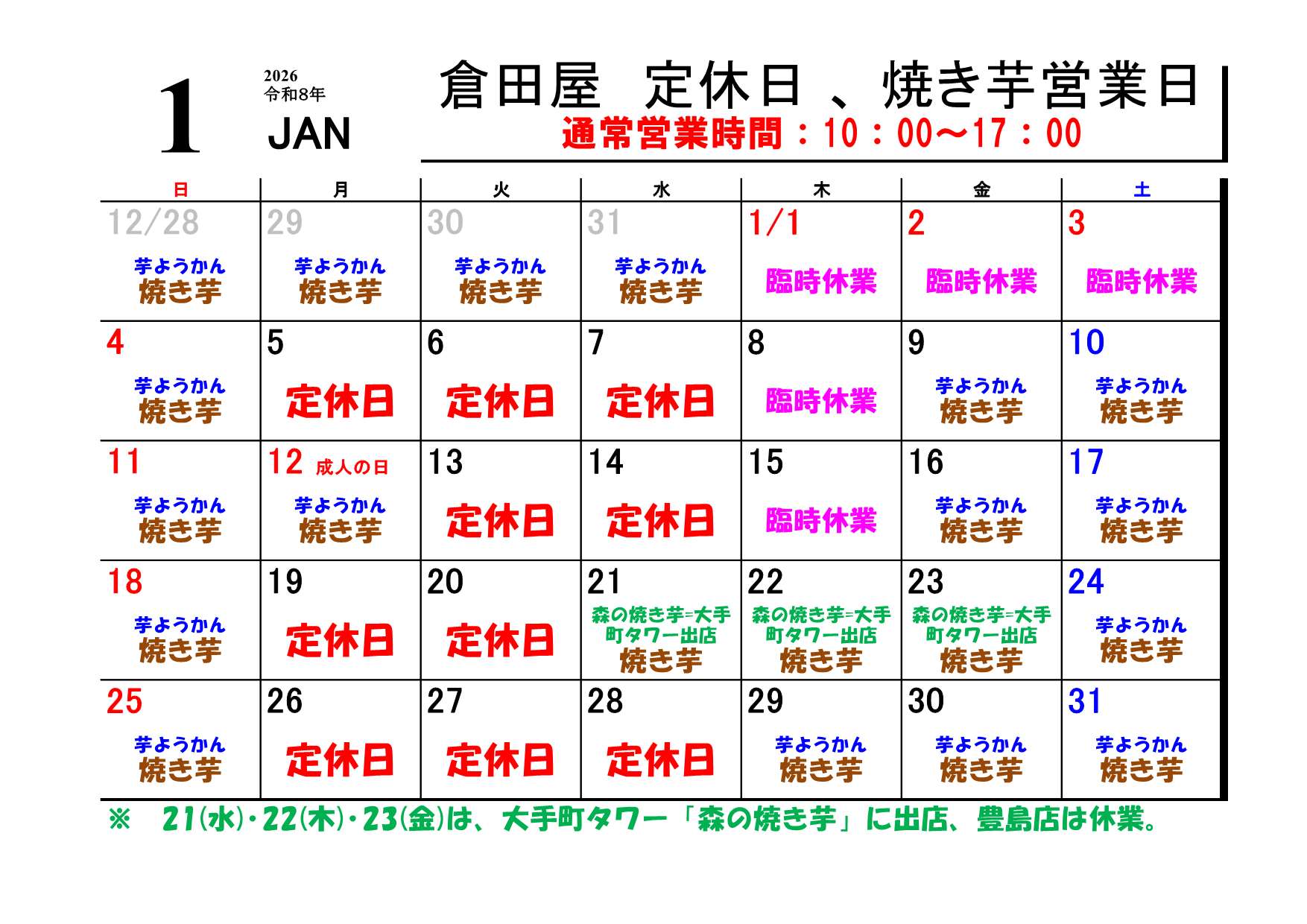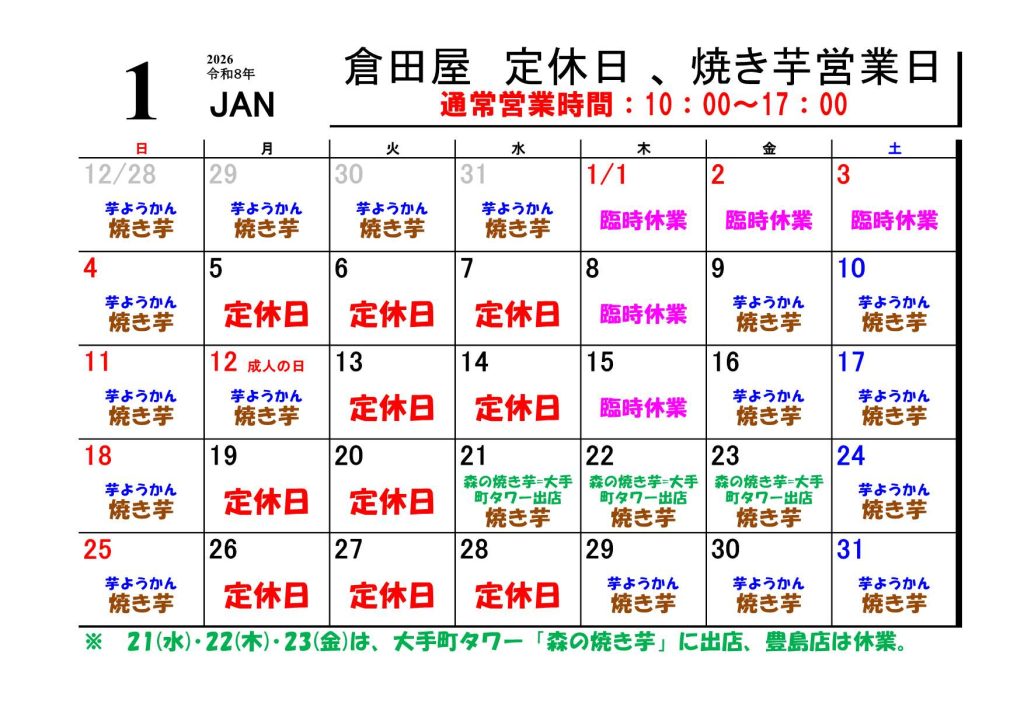 1月の倉田屋の営業は下記のように行います。