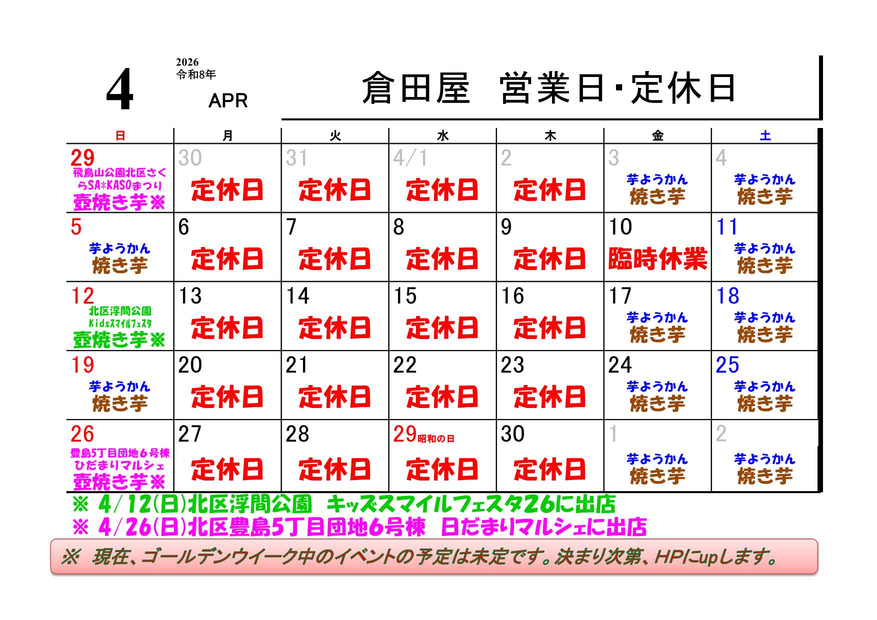 2026年4月の営業日について・4月12日(日)はキッズスマイルフェスタ26に出店